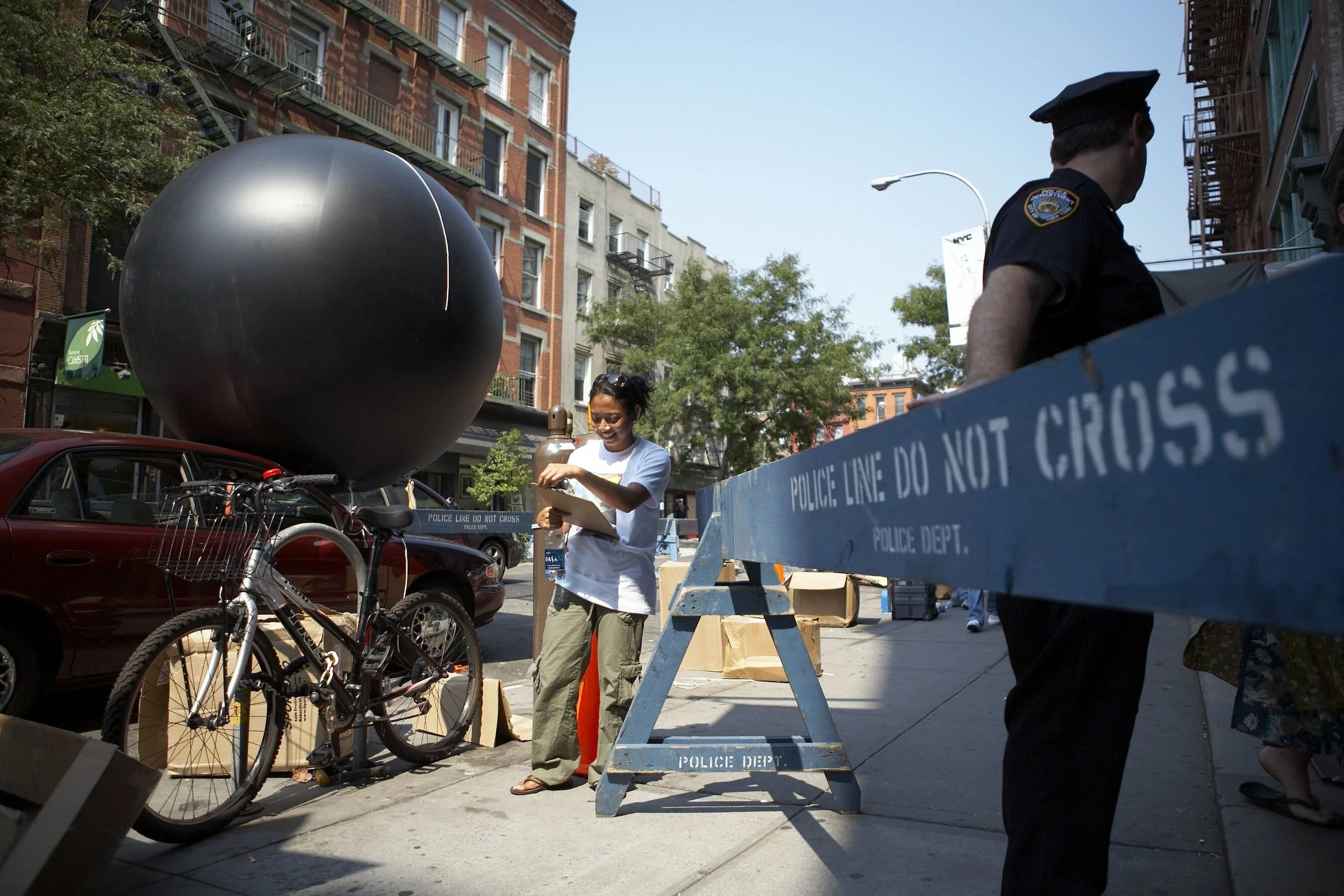 Veterans of the parade returned year after year. Kenny Scharf's art cars... Yoko Ono... Damien Hirst... Fischerspooner, with their electric mylar dance-rock floats... Kembra Pfahler’s band of blue-skinned furies, the Girls of Karen Black, moving down West Broadway at a funereal pace, bloody dolls clutched in their arms.. the Malcolm X Shabazz High School marching band... Sexy Cops... local legend-in-the-works Swoon... Nick van Woert’s Bobble Head Collective, with its giant crazed stockbroker masks... Steve Powers aka ESPO reprising his 2005 inflatable black limousine in 2007, a salute to celebrity gas guzzling... and so many more.
