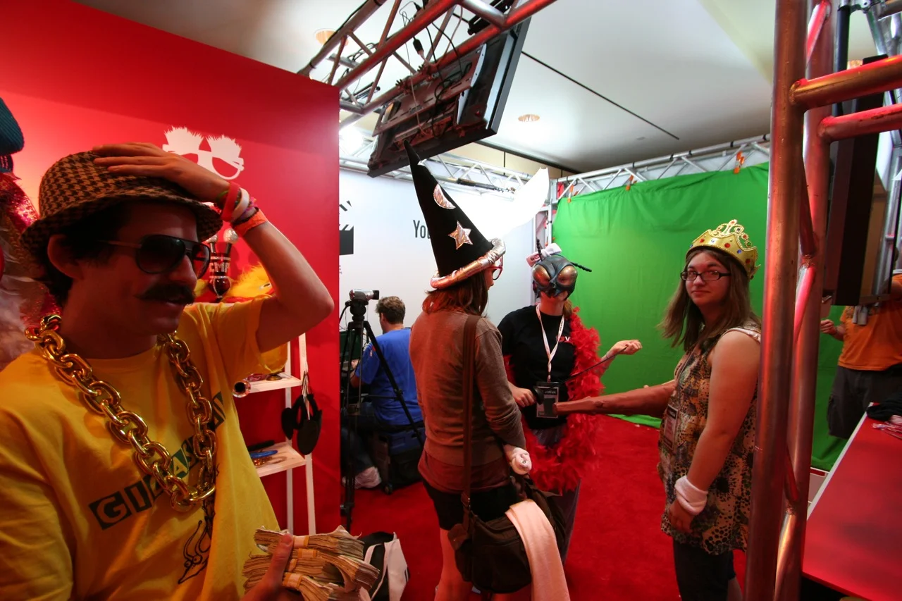 VidCon2011 sponsor YouTube creates some fun with the PLAY ROOM. Featuring green screen photo booths, a digital graffiti wall, snacks and smoothies, a customize-your-t-shirt station and the "Hit Factory" - which allowed guests to record an original autotune song, then pick out costumes and props for a green screen music video shoot. Guests received their music videos on a flash drive and posted online using YouTube upload stations